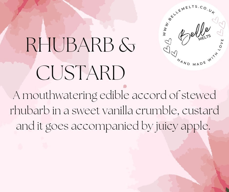 Our Rhubarb & Custard fragrance is lovingly made in Wigan, Lancashire by Belle Melts. We hand-pour in small artisan batches using premium oils and materials for rich, lasting scent experiences. Every product is packed with care and shipped in 3–5 working days.